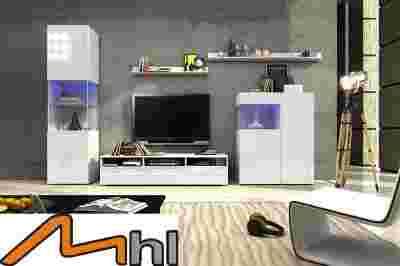 Zestaw mebli do pokoju dziennego NICEA 2 z frontami w wysokim połysku i oświetleniem LED.