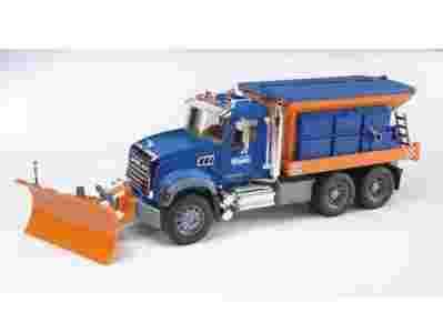 Model ciężarówki MACK Granit serwis zimowy. Przedni spychacz można podnosić i opuszczać, regulować kąt pracy w zakresie +/-30 stopni lub całkowicie zdemontować. Posypywarkę wyposażono w otwierany zbiornik do zasypywania piaskiem oraz składany do transportu moduł rozsypujący. Obok tarczy posypywarki znajduje się składana drabinka Przednie okno kabiny ciężarówki wykonano z wysokiej jakości przezroczystego poliwęglanu. Drzwi kabiny można otwierać, a zewnętrzne lusterka składać. Błyszczące chromem elementy oddają charakter amerykańskiej marki. Gigantyczne rozmiary zabawki i ogromna ilość funkcji połączona z maksymalną dbałością o szczegóły wykonania dostarczą małym drogowcom niezapomnianych wrażeń.