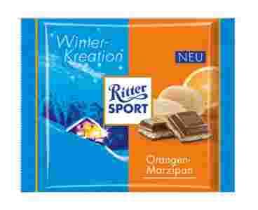 Ritter Sport - czekolada mleczna z nadzieniem z pomarańczy i marcepanu. To słynna, niemiecka czekolada w kształcie kwadrata dla ludzi lubiących się wyróżniać. Ritter Sport oferuje szeroką gamę smaków czekolad z dodatkami, dopasowana do indywidualnych upodobań smakowych.
