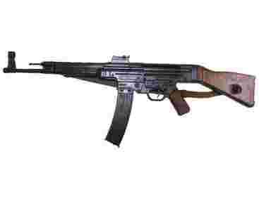 Karabin StG 44 (Sturmgewehr 44) znana również jako MP43 lub MP44, Cal. 7,92mm, Niemcy 1943 (II wojna światowa), ze skórzanym paskiem. Zaprojektowany i wyprodukowany przez Haenela AG, w dalszym ciągu produkowany przez Mauser-Werke Carl Walter, Steyr-Werke, Erma, w Sauer-Gruppe. Nowa broń była testowana i wysyłane na front wschodni w Związku Radzieckim, gdzie stwierdzono jej wysoką skuteczność. MP-43 był pierwszym karabinem szturmowy produkowany na świecie i był źródłem większości wzorów nowoczesnych karabinów szturmowych.