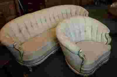 Przepiękny komplet kawowy w skład którego wchodzą: 3-os. sofa i fotel. Elegancka, drewniana rama pokryta jest specjalną powłoką dającą efekt postarzenia i spękania.