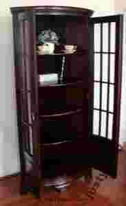 Przedmiotem aukcji jest przepiękna witryna wykonana w całości z litego drzewa mahoniowego w kolorze ciemnobrązowym (ciemny kasztan delikatnie przechodzący w mahoń). Lite drewno oraz uchylne jednoskrzydłowe drzwi. Witryna jest bardzo solidnie i precyzyjnie wykonana. Mosiężne uchwyty.W środku 5 półek. Produkt jest nowy.