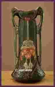 Dekoracyjny duży wazon w secesyjnym stylu, wykonany z majoliki. Naczynie ma piękny kształt o miękkich, wręcz płynnych liniach i pokryte jest błyszczącym szkliwem utrzymanym w odcieniach turkusu. Znakomite, ręcznie malowane zdobienia w formie motywów kwiatowych doskonale współgrają z uchwytami wazonu. Przedmiot na spodzie sygnowany jest numerem. Stan bardzo dobry, jak na zdjęciach.