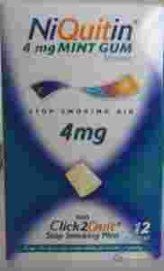 Wskazania: Łagodzenie objawów wynikających z odstawienia nikotyny, w tym uczucia głodu nikotynowego, związanych z rzucaniem palenia. Zaleca się jednoczesne stosowanie programu wspierającego rzucenie palenia. Preparat NiQuitin Gumy 4 mg jest przeznaczony dla palaczy, którzy wypalają pierwszego papierosa w ciągu 30 minut od przebudzenia. Dawkowanie: Doustnie. Gumę należy żuć, gdy wystąpi chęć zapalenia papierosa. Trzymając gumę w ustach nie należy jeść ani pić gdyż to może zmniejszyć wchłanianie się nikotyny. Zaleca się stosowanie 8-12 kostek dziennie, dawka maksymalna wynosi 15 kostek. Jedną kostkę można żuć przez 30 minut. Kurację należy stosować maksymalnie przez 3 miesiące, a następnie stopniowo ograniczać stosowanie gumy. Kiedy dziennie zużywa się 1-2 kostek gumy, należy zaprzestać stosowania. W przypadku osób stosujących gumę w dawce 4 mg, dawka 2 mg może być pomocna w okresie odstawiennym kuracji. Nie stosować do ukończenia 18 roku życia. Możliwe skutki uboczne: Na początku kuracji nikotyna może wywoływać podrażnienie gardła, nadmierne wydzielanie śliny. Połykanie rozpuszczonej nikotyny może powodować czkawkę. Często występują: ból i zawroty głowy, nudności, wymioty, zaburzenia żołądkowo-jelitowe, czkawka, ból mięśni okołoszczękowych, gardła, suchość warg. Rzadziej: palpitacje serca, rumień, pokrzywka, zapalenie jamy ustnej. Preparat stosowany zgodnie z zaleceniami nie wpływa na sprawność psychomotoryczną, zdolność prowadzenia pojazdów oraz obsługę maszyn. Poinformuj lekarza: Gdy masz nadwrażliwość na składniki preparatu, dławicę piersiową, zaburzenia rytmu serca, zaburzenia czynności nerek lub wątroby, cukrzycę, nadczynność tarczycy. Gdy przyjmujesz kofeinę, fenazon, teofilinę, imipraminę, pentazocynę, fenacetynę, fenylbutazon, takrynę, klomipraminę, olanzapinę, fluwoksamine, flekainid, insulinę, estrogeny, diazepam, oksazepam, warfarynę, propranolol, nifedypinę, leki przeciwastmatyczne.Jeśli jesteś lub przypuszczasz, że jesteś w ciąży, a także gdy karmisz piersią. Preparat jest przeciwwskazany w ciąży i okresie karmienia piersią.