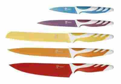 - Każdy nóż z kompletu jest w innym kolorze – niebieskim, fioletowym, żółtym, pomarańczowym i czerwonym