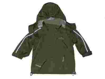 szwy gumowane, kaptur odpinany, odblaski, chroni przed wiatrem i deszczem (ale nie jest w 100% nieprzemakalna)