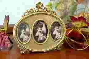 Pełna nostalgii, owalna ramka na trzy fotografie w stylu lat dziewięćdziesiatych XIX wieku.