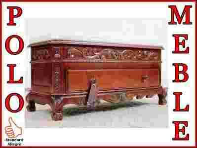 Przedmiotem aukcji jest stylowa pufa/skrzynia, ręcznie zdobiona i tapicerowana. Wykonana została z litego drewna egzotycznego w kolorze czereśni antycznej. Ozdobą mebelka są gięte nogi oraz boczne rzeźbienia. Uroku dodaje praktyczna obszerna szuflada i schowek pod siedziskiem. Pufa jest bardzo elegancka i bardzo praktyczna. Posiada folię ochronną na materiale obiciowym. wymiary: szerokość 90 cm głębokość 38 cm wysokość 46 cm