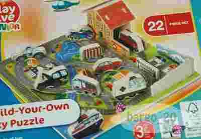 Z puzzli trzeba ułożyć drewniane miasteczko po którym jeżdżą drewniane samochodziki.