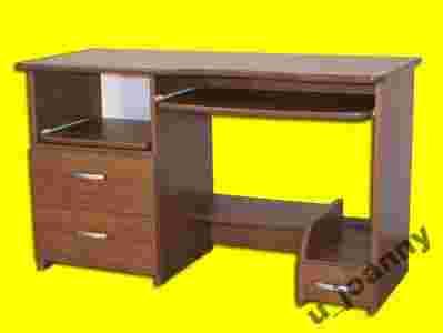 Biurko wykonane z wysokiej jakości płyty laminowanej o grubości 18mm w kolorze olcha. Blat, półka pod klawiaturę, półka pod drukarkę i półka nad szufladami zaowalone wykończone miękkim profilem PCV w kolorze laminatu. Biurko posiada trzy szuflady osadzone na plastykowych prowadnicach i praktyczną wysuwną półkę nad szufladami. Biurko posiada również wysuwną półkę pod klawiaturę osadzoną na metalowych prowadnicach rolkowych. Uchwyty szuflad plastykowe w kolorze satynowym. Biurko stoi na plastykowych ślizgaczach.