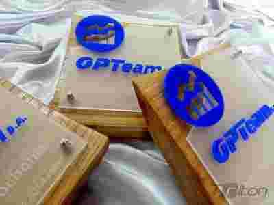 Nowoczesna statuetka z pleksi_drewno logo firmowe