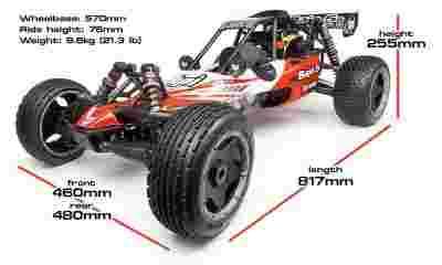 Model HPI Baja 5B 2.0 w nowym wcieleniu. Skala 1:5 nadaje zabawie zupełnie nowy wymiar. Baja 5B 2.0 jest modelem samochodu typu buggy w skali 1:5, czyli ma ponad 80 centymetrów długości! Ten model to rewolucja w dziedzinie wielkoskalowego modelarstwa RC. Model nawiązuje do samochodów typu Baja (długie wahacze, duży skok zawieszenia). Duży rozmiar pozwala modelowi Baja 5B dotrzeć tam, gdzie mniejsze modele nie dają rady. Baja 5B jest duża, ale jest to model gotowy do jazdy zasilany standardowym paliwem samochodowym tak więc rozpoczęcie zabawy jest bardzo proste. Wszystko jest dołączone do zestawu - kompletne zmontowane podwozie, wysokiej jakości aparatura radiowa FM oraz zamontowany silnik o pojemności 23 ccm. Jedyne co trzeba zrobić to nalać paliwa i oleju, odpalić i jeździć!