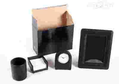 Bardzo dobrze wykonany ekoskórzany zestaw na biurko składający się z czterech elementów: