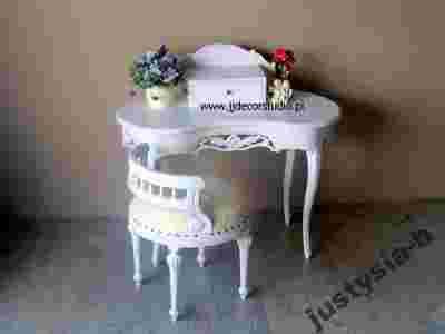 Przedmiotem aukcji jest elegancki sekretarzyk- konsola- stolik, z niezwykłymi zdobieniami wykonana w całości z litego drzewa mahoniowego w kolorze białym. Konsola jest bardzo solidnie i precyzyjnie wykonana. Główny jej atut to piękne, ręcznie wykonane zdobienia. Konsola jest nowa. W komplecie z krzesełkiem