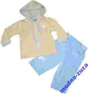 Bluza na delikatnym meszku z kapturem podszywanym dodatkowa warstwa w paski,ściągany za pomocą wciągniętych troczków . Bluza zapinana jest po całości na suwak, dzięki czemu łatwo ją założyć i zdjąć dziecku.