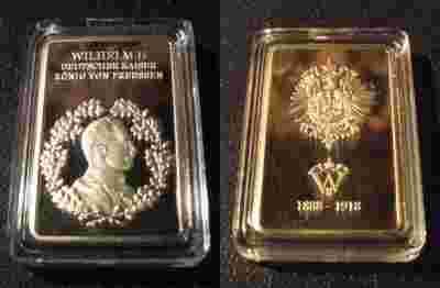 Do sprzedania pozłacana sztabka kolekcjonerska upamiętniająca Wilhelma II... piękna i gustowna, przechowywana w kapslu !Wygląd sztabki / numizmatu i jego stan zachowania widoczny na załączonych zdjęciach... Nie mam pojęcia o wartości czy oryginalności tej sztabki, dlatego ocenę i decyzję o zakupie pozostawiam Kupującemu nie akceptując zwrotu - widzisz, czytasz, a więc wiesz co świadomie kupujesz !