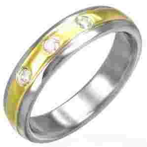 Obrączka ze stali chirurgicznej 316L, dwukolorowa z 3 cyrkoniami, błyszcząca. Środkowy pasek pozłacany.