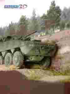 W gablocie diorama prezentująca Kołowy Transporter Opancerzony "Rosomak" w pędzie. Dnia dzisiejszego, Rosomak konstrukcji fińskiej produkowany jest w Polsce na licencji.