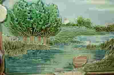 Pierwsze kafle, tzw. garnkowe pojawiły się w XI wieku w Europie. W Polsce rozpowszechniły się od początku XIV wieku. Miały one kształt garnków wmurowanych w ścianę pieca, otworem na zewnątrz. Kafle garnkowe wyrabiano na kole garncarskim. W drugiej połowie XIX wieku wzrost zapotrzebowania na kafle i zmechanizowanie ich wyrobu spowodowały, że kafle gładkie, jednobarwne zdominowały rynek. Dekoracyjny z założenia kafel ceramiczny staje się dziełem sztuki dzięki kunsztowi w oddawaniu szczegółów, natłoku elementów i precyzji wykonania. Kwieciste, secesyjne z ducha obramowanie na które składa się silnie stylizowana łodyga z białymi kwiatami okalająca właściwy prostokąt obrazu. Widać na nim zakole rzeki, sylwetki wierzb, a w oddali na linii horyzontu białą bryłę wiejskiego kościoła. Sielankowy nastrój współtworzony jest delikatnymi kłębami chmur na błękitnym niebie.