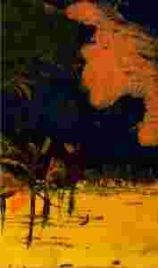 Obraz przedstawia tajemniczą oazę z granatowym niebem i pomarańczowymi, podświetlonymi słońcem chmurami w tle.
