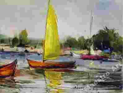 Pragniemy zaoferować Państwu kupno obrazu autorstwa Klaudiusza Kołodziejskiego "Zima". Na obrazie widzimy pokryty malownicze łódki płynące po jeziorze..