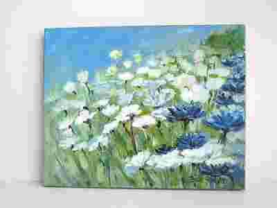Obraz olejny kwiaty rumianki pejzaż 50 x 40