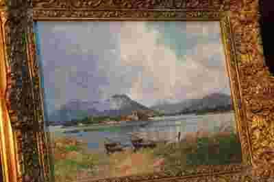 Drodzy Państwo przedstawiam obraz niemieckiego malarza, pejzażysty przedstawiający malowniczą panoramę Jeziora Chiemsee w południowo - wschodnich Niemczech na Wyżynie Bawarskiej. Obraz został namalowany na drewnie mahoniowy farbami olejnymi, można dostrzec precyzyjne pociągnięcia pędzlem. Na pierwszym planie artysta umieścił wybrzeże z dwoma łódkami, zaś w oddali widać wyspę z klasztorem oraz zabudowaniami. Obraz utrzymany jest w tonacji pochmurnej. Rama obrazu została wykonana w pełni z drewna, wraz z wszystkimi ornamentami i dodatkowo pozłocona. Rama nie posiada żadnych gipsowych ozdób. Całość jest bez uszkodzeń po wyczyszczeniu i zawerniksowaniu. Życzę udanej licytacji.
