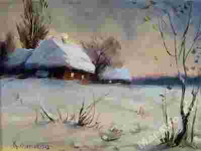 Pragniemy zaoferować Państwu kupno obrazu autorstwa Klaudiusza Kołodziejskiego "Zima". Na obrazie widzimy pokryty śniegiem dworek.