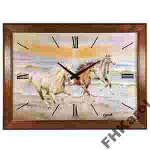 Prezentowany zegar/obraz przedstawia konie w galopie. Nie byłoby w tym nic nadzwyczajnego, gdyby nie to, że spośród wielu obrazów z końmi, ten zachwyca każdego klienta, a dodatkowo ciesząc oko można odczytać godzinę. Rysy zwierząt są nieregularne i przez to wydają się być jeszcze bardziej dynamiczne...a przez to realne. Równie efektowna jest drewniana rama - wykonanie skupione na celowym postarzeniu drewna - została ręcznie wylakierowana na orzech.