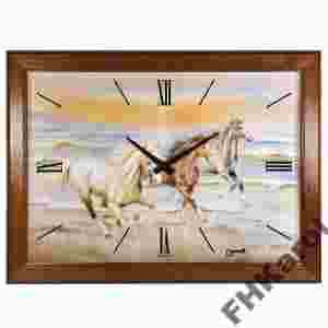 Prezentowany zegar/obraz przedstawia konie w galopie. Nie byłoby w tym nic nadzwyczajnego, gdyby nie to, że spośród wielu obrazów z końmi, ten zachwyca każdego klienta, a dodatkowo ciesząc oko można odczytać godzinę. Rysy zwierząt są nieregularne i przez to wydają się być jeszcze bardziej dynamiczne...a przez to realne. Równie efektowna jest drewniana rama - wykonanie skupione na celowym postarzeniu drewna - została ręcznie wylakierowana na orzech.