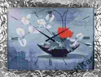 Prezentowany zegar/obraz przedstawia kilka nieregularnie namalowanych liści, spośród wyrastają piękne czerwone kwiaty. Tło jest również bardzo ciekawe, pokryte artystycznymi napisami i fragmentami florystycznych ornamentów. Najbardziej efektowna jest jednak, bez wątpienia, rama w kolorze srebrnym - wykonana z ciekawego masywnego tynku, lakierowana na wysoki połysk. Nie jest gładka, lecz posiada nieregularne metaliczne nacieki. Kolor obramowania nigdy nie będzie jednolity, lecz wygląda jakby wciąż odbijało się w nim światło. Generalnie efekt ram wykonanych z tego rodzaju tynku jest naprawdę olśniewający i zwraca uwagę każdego, kto po raz pierwszy widzi obraz.