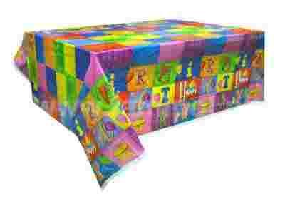 Obrus foliowy prostokątny z kolorowymi wzorami i napisem "Happy Birthday"
