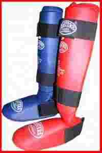 Ochraniacze piszczeli i stopy profilowane, twardy wkład chroniący piszczel, materiał skóropodobny, zapięcie na gumowany pas z rzepami. Stópkę można odpiąć i używać samego ochraniacza piszczeli. Dostępne kolory: czarny, czerwony, niebieski.