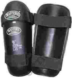 Ochraniacze piszczeli z anatomicznie uformowanym wkładem amortyzującym, wykonane ze skóry syntetycznej, zapinane na pas parciany z rzepem.