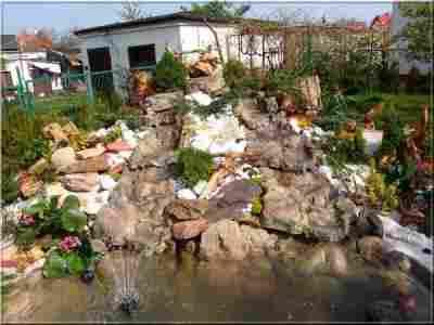Kompleksowej usługi montażu skalnego stawu o wymiarach 270/180/90 o pojemności 1000 litrów wraz ze skalniakiem z wkomponowaną kaskadą wodna o długości 3 metrów oraz aranżacją otoczenia kaskady.