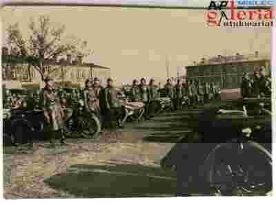 Oddział motocyklowo-czołgowy, przedwojenny. Prawdopodobnie w jakichś koszarach. Reprodukcja własna. Format A-6 na kartoniku. Na sprzedawanym zdjęciu nie ma logo galerii. Stan bdb.