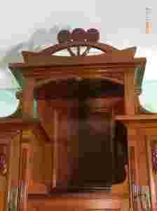 OPIS. Piękny kredens secesyjny z 1900 roku, doskonale zaprojektowany i wykonany z dużą starannością. Kredens ma sosnową konstrukcją pokrytą orzechową okleiną, niektóre z elementów zrobiono z litego drewna orzecha. Kredens do transportu można podzielić na dwie części. Podstawa kredensu to szafka z dwojgiem drzwiczek, dwiema szufladami i wysuwanym pomocniczym blatem. Górna część kredensu składa się z trzech zamykanych szafek i otwartej wnęki. Środkowe drzwiczki w nadstawce mają witrażową szybę wykonaną z kryształowego szkła w mosiężnych ramkach. Zamki w meblu są sprawne i dostępne są do nich dwa kluczyki. Drewno w meblu jest zdrowe i nie widać śladów po szkodnikach.