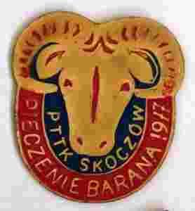 przedmiotem aukcji jest odznaka "Pieczenie barana – PTTK Skoczów 1977"