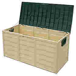 skrzynia wykonana z plastiku, szybka do montażu na zatrzaski, pojemność 227 ltr, wymiary 51x56x114 cm, kolor kremowy i zielony, nie służy do siadania na niej