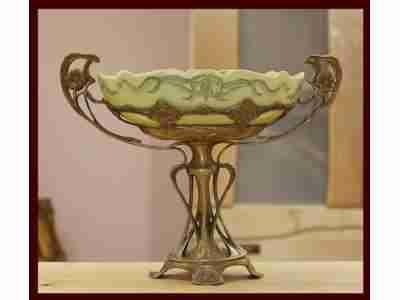 ŚLICZNA, DUŻA PATERA WYKONANA Z PORCELANY CRAQELLE, WYKOŃCZONA BRĄZEM. RĘCZNIE MALOWANE MOTYWY KWIATOWE IDEALNIE KOMPONUJĄ Z OZDOBNYMI UCHWYTAMI W KSZTAŁCIE ŁODYG KWIATÓW, WYKONANYMI Z BRĄZU. PODSTAWA PATERY WYKONANA Z BRĄZU. WZÓR Z ROKU 1906, CHARAKTERYSTYCZNY DLA SECESJI. BARDZO EKSKLUZYWNY PRZEDMIOT.