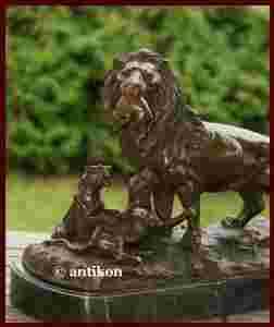 Wspaniała duża rzeźba z prawdziwego brązu, osadzona na eliptycznym marmurowym postumencie. Przedstawia lwią rodzinę. Na szczególną uwagę zasługuje potężna, wręcz magnetyczna, figura lwa trzymającego w paszczy upolowaną zwierzynę. Przepięknie oddano silną budowę ciała zwierzęcia. U stóp majestatycznego lwiego króla pokładają się w ekspresyjnym geście dwa młode lwy, które nadają całości dynamicznego charakteru. Lew to symbol siły, potęgi, prestiżu i najwyższej władzy. Dbałość o szczegóły oraz solidność wykonania wskazują na wysokie walory artystyczne tego znakomitego dzieła rzeźbiarskiego. Sygnatura P.J. Mene. Rzeźba jest bardzo ciężka. Stylowa i elegancka, niebanalna ozdoba biura, gabinetu, salonu lub biblioteki.