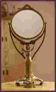 Prześliczne, salonowe, bardzo duże, figuralne lustro. Wspaniałe okrągłe zwierciadło oprawione jest i wsparte na podstawie wykonanej z brązu. Lustro podtrzymuje piękna kobieca postać, co nawiązuje do antycznych podpór architektonicznych - kariatyd. Szata kobiety płynnie przechodzi w pełne finezji linearne dekoracje podstawy. Oprawa zwieńczona jest przez kwiatową girlandę, która powtarza się nad głową figury. Znakomite, majestatyczne zdobienia tworzą niebanalne obramowanie dla lustra. Całość stanowi stylową i elegancką ozdobę, a zarazem niezwykle funkcjonalny przedmiot, doskonały na prezent.