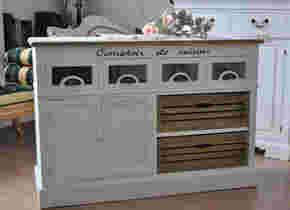 Pojemna szafka, cztery szufladki o niebanalnym wykonczeniu, dwie duże szuflady, których fronty zrobione sa z drewnianych szczebelków, całości dopełniają dekoracyjny napis: Comptoir de cuisine (Bufet kuchenny)