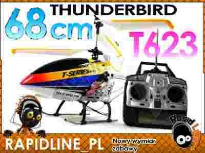 Cesarz wszech niebios, sułtan firmamentu niebieskiego, T623 THUNDERBIRD to wielki zdalnie sterowany śmigłowiec którego określić można jeszcze wieloma podobnie dowcipnymi ale prawdziwymi epitetami. Maszyna imponująca swoimi rozmiarami w pełni zasługująca na miano podniebnego zdobywcy. Doskonały pod każdym względem czy to wizualnym, technicznym czy też konstrukcyjnym. Helikopter wymagający skupienia i rozwagi w zamian oferujący niepowtarzalne chwile podniebnej zabawy w połączeniu z potężną dawką adrenaliny której wydzielanie towarzyszyć wam będzie podczas podniebnych ewolucji tego wspaniałego statku powietrznego.