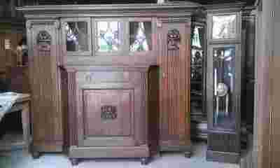 Okazały kredens z okresu międzywojennego, w całości drewniany, fornirowany i wykończony dębem.