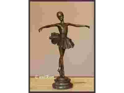 Wspaniała figura baletnicy w stylu art deco. Postać eterycznej tancerki zdaje się płynąć na czubkach palców. Młodziutka dziewczyna w baletowej pozie, stojąc na pointach, zachwyca elegancją. Poprzez odpowiednie modelowanie i cyzelowanie doskonale zróżnicowano fakturę tutu - krótkiej spódniczki baleriny od reszty jej ubioru i odsłoniętych partii ciała. Staranność wykonania i dbałość o szczegóły wskazują na wysokie walory artystyczne rzeźby. Urzekająca rzeźba z prawdziwego brązu osadzona na kolistej marmurowej podstawie. Sygnowana pieczęcią francuskiej wytwórni brązów. Stan przedmiotu bardzo dobry, bez uszkodzeń.