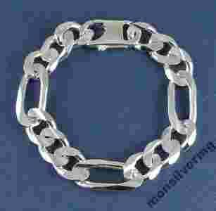 Przedmiotem aukcji jest masywna męska bransoleta o tradycyjnym splocie figaro. Szerokość ogniwka 15mm. Wykonana ze srebra próby 925. Długość ok 25 cm.