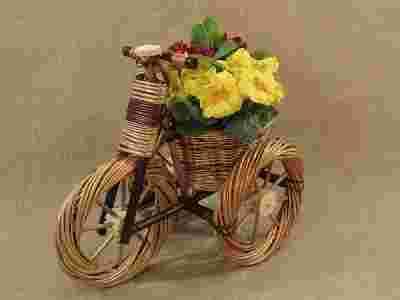 Nowy wiklinowy kwietnik rowerek (średni) z koszem - doniczką na jeden kwiatek. Doskonale prezentuje się w domu, na tarasie lub ogrodzie. Super pojemniki na kwiaty, zioła.