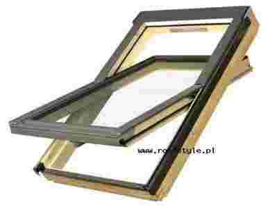 Okna obrotowe FAKRO FTS-V są wykonane z drewna sosnowego klasy extra, impregnowanego prózniowo i dwukrotnie malowane ekologicznym lakierem akrylowym. Ponadto drewno osłonięte jest z zewnątrz odpornymi na działanie czynników atmosferycznych profilami z blachy aluminiowej. Zawias umieszczony w połowie wysokości okna, umożliwia obrót skrzydła i pozostawienie go w pozycji otwartej. Skrzydło można również obracać wokół osi o 180° i zablokować je zasuwką ryglującą, co pozwala na wygodne i bezpieczne mycie zewnętrznej szyby okna. W Oknie tym zastosowano nawiewnik V10 zapewniający napływ powietrza nawet przy szczelnie zamkniętym oknie.