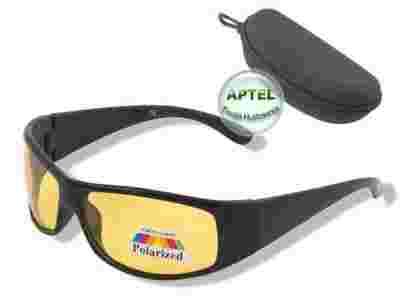 - Kolor: czarne lakierowane oprawki, szkła w żółtym odcieniu.
